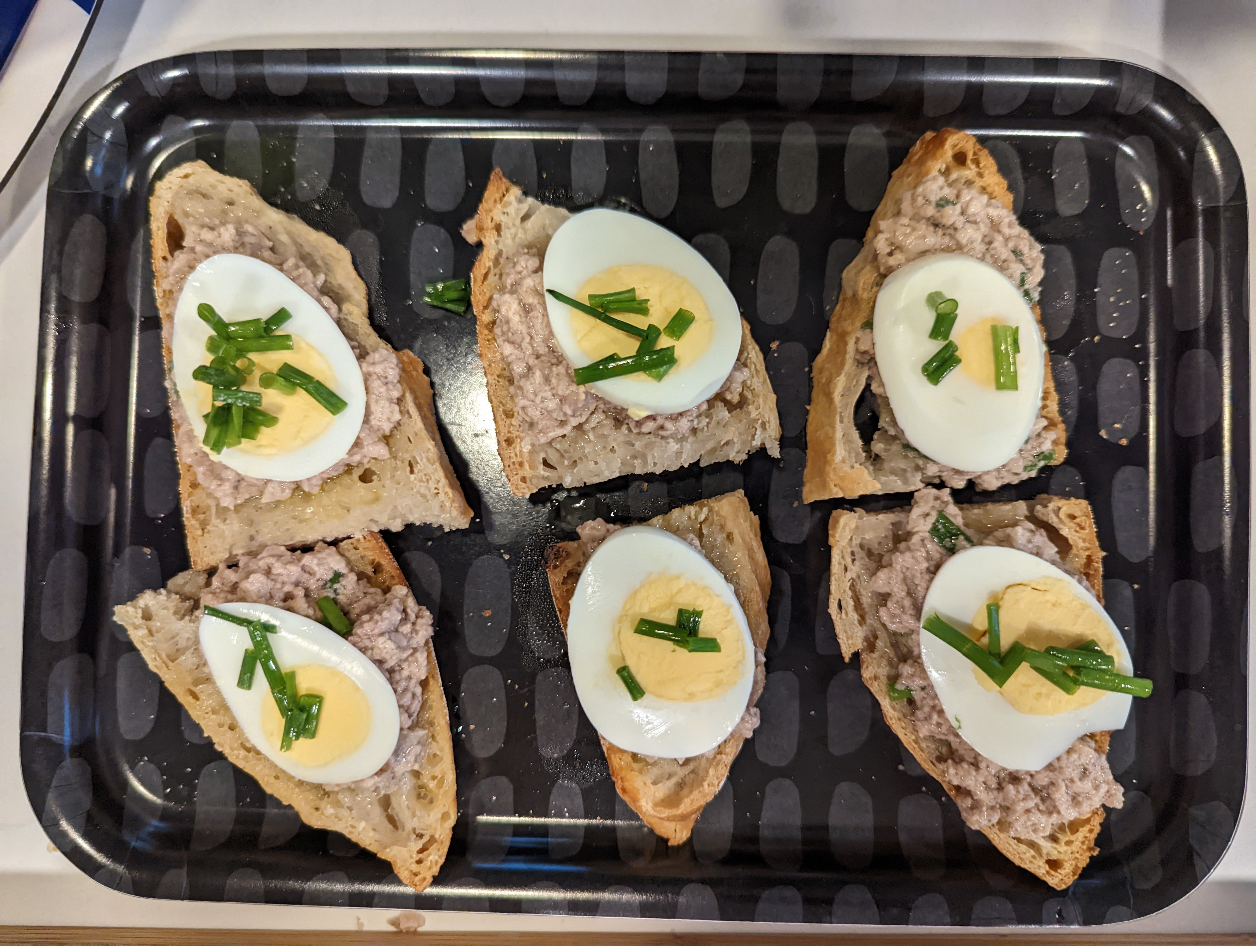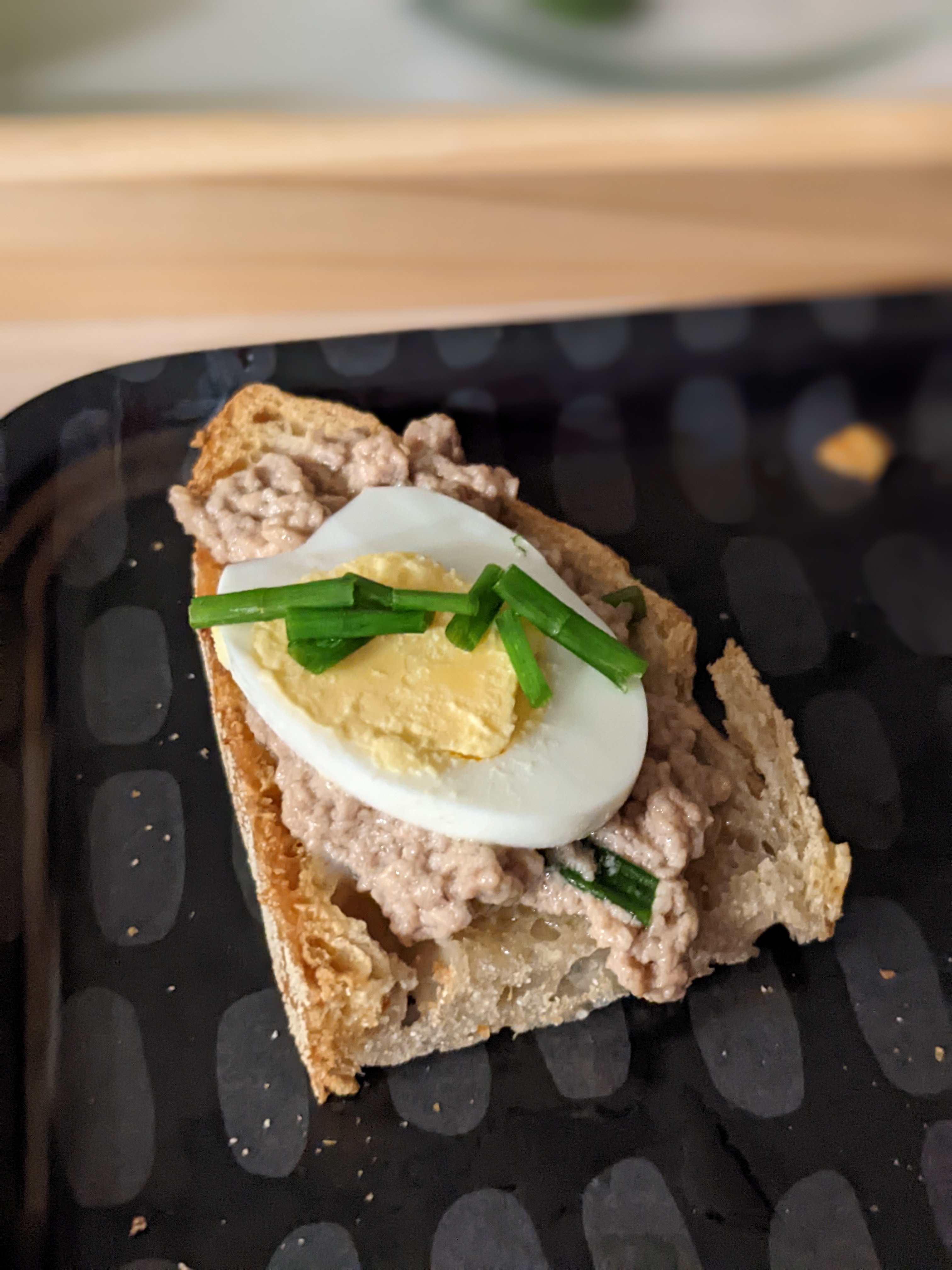 Top toast with mashed cod liver. Add a slice of egg and top with chives. Enjoy!