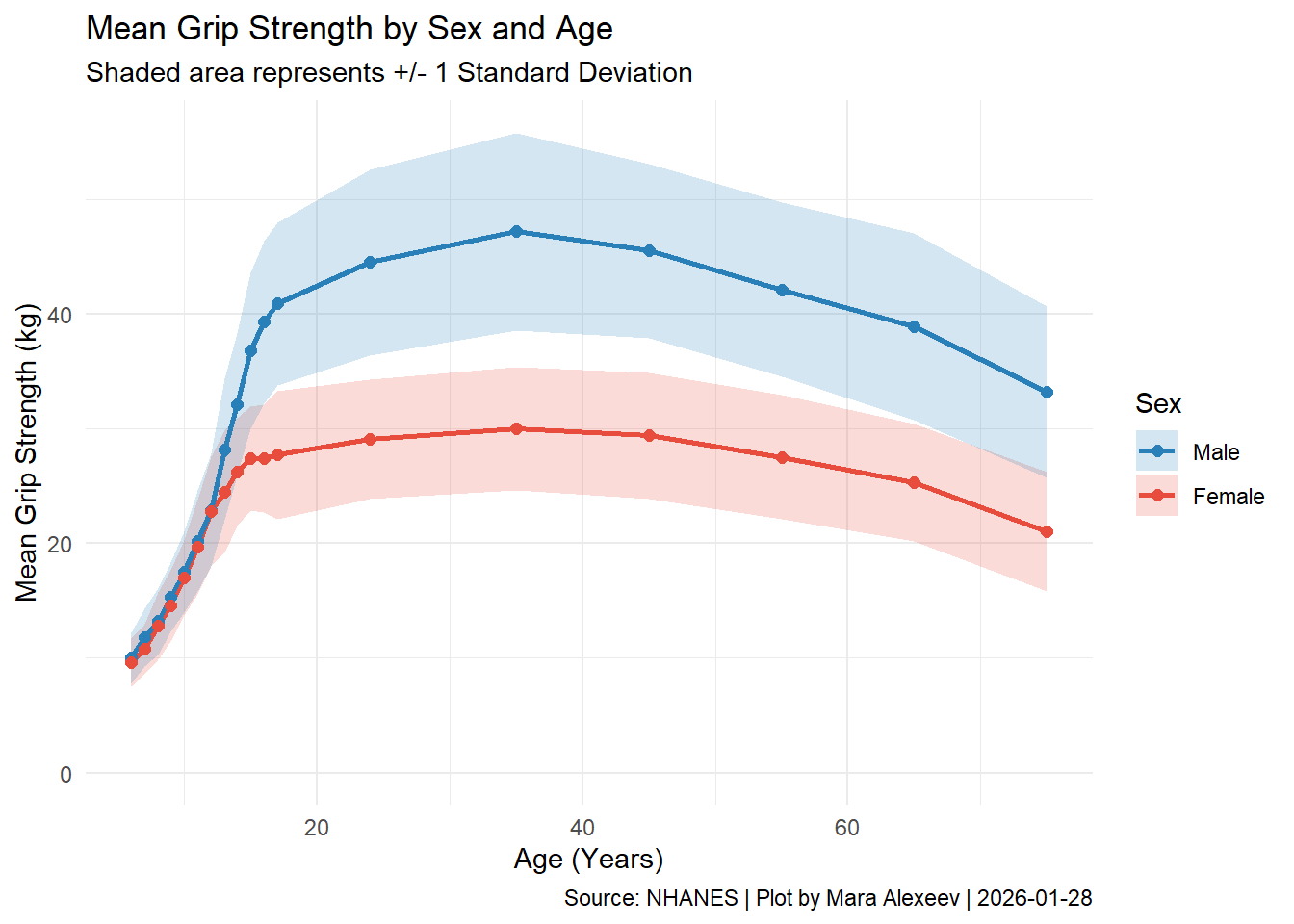 grip_plot <- ggplot(grip_data_clean, aes(x = age_point_for_plotting, y = nhanes_mean_kg, color = sex, fill = sex)) +